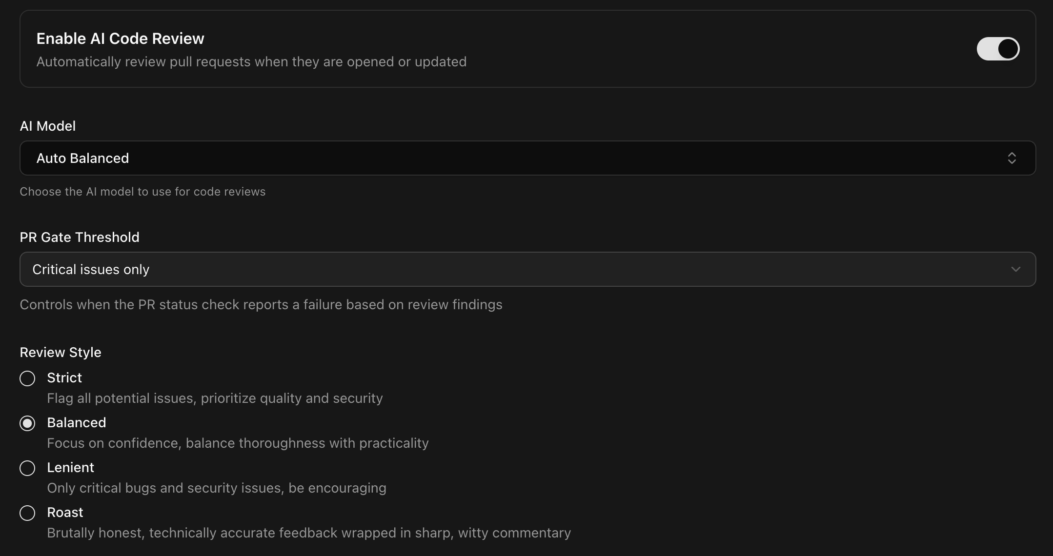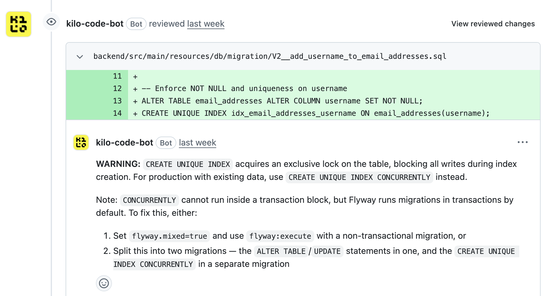 Because I tend to let AI generate the huge majority of my code, I use a second AI as reviewer of the created Pull Requests. I have been using Claude Code locally a lot, but I love the team behind Kilo.AI and they've been my tool of choice for pull requests reviewing. I like that I can select what sort of review I want, and how extensive.